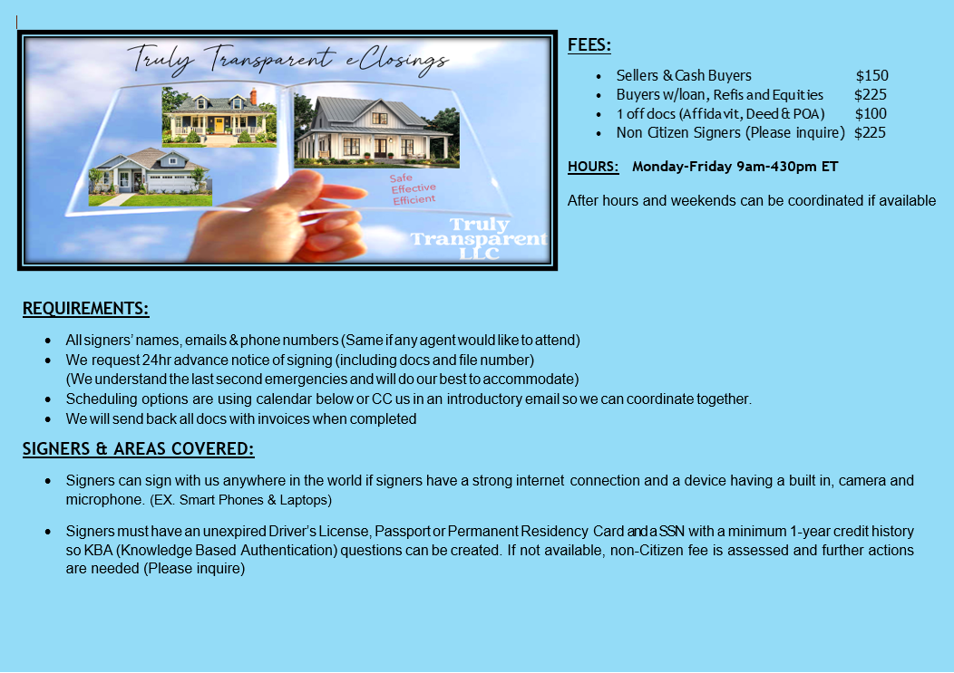 Schedule your appointment on our calendar. All signings are provided a 30 minute window. Once you have scheduled please provide all info regarding your signing to Nickf@tteclosings.com at least 24hours prior to the scheduled meeting.